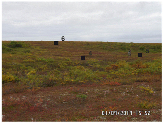 The second field experiment was accomplished on the test site at Rogozhny Cape (see Figure 1) in 1–6 September 2019, when seasonal thawing of hummocky tundra was the deepest, 50–70 cm, the mean daily air T was 8.6 °C, and relative air humidity varied within 60–98%. Drizzle was observed on 2–4 September (2.1 mm in total).