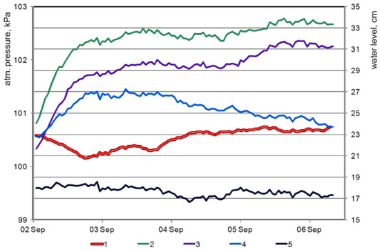 Certain features of the baric effect in the first field experiment are an indirect confirmation of its explanation described in this paper. As seen in Figure 6, the WL response record was most prominent in pit No. 2, located in the hillside of the slope hollow. The other observations in the drainage network elements (hollow-stream-river) demonstrate a different degree of the blurring and transformation of this response. At the same time, a shift of the baric effect over time was observed at different points of the basin, which is naturally explained by the influence of flow travel times along the drainage network.