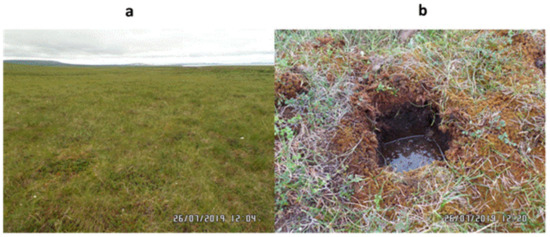 Pit No. 2 was dug on the right side of this water track among hummocky tundra, covered by subshrub–moss–cotton grass vegetation and peaty soil (Figure 4a). Both pits, spaced 20 m apart, were made at the underside of a gentle slope about 1000 m in length and remote at less than 100 m from the channel of the 1st order draining stream—the Yagodny Creek.