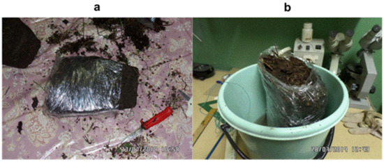 The volume of the sample No. 1 was 3900 cm3 (weight—4300 g), and the volume of the sample No. 2 was 9828 cm3 (weight—3834 g). The sample No. 2 had a larger volume and lesser density due to the top 5-cm-thick layer of sphagnum moss tirr. Both samples were isolated with a polyethylene film (Figure 10a), and then placed into plastic tubs with a volume of 11,000 cm3, filled with water up to few cm from the bottom (Figure 10b).