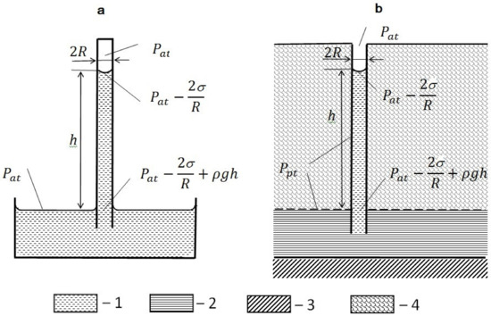 As shown in the diagram (Figure 12a), the equation of the equilibrium of a liquid in a capillary, which is connected to the level of gravitational water, looks as follows [15]: