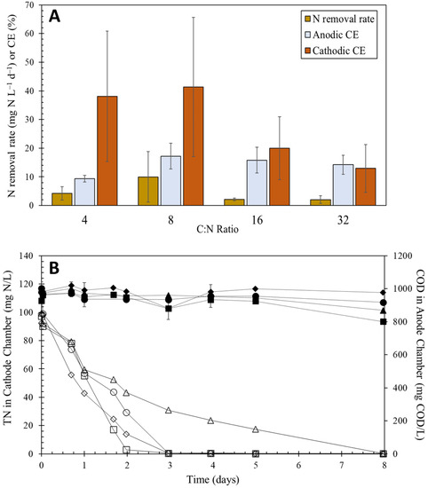 (A) Average nitrogen removal rates, anodic CE, and cathodic CE among MFC replicates. n = 4, 3, 3, and 4 for C:N ratios of 4, 8, 16, and 32, respectively; (B) concentrations of anode carbon (unfilled) and total cathode nitrogen (filled) for all replicates during 4 C:N. each shape in (B) represents a different replicate.