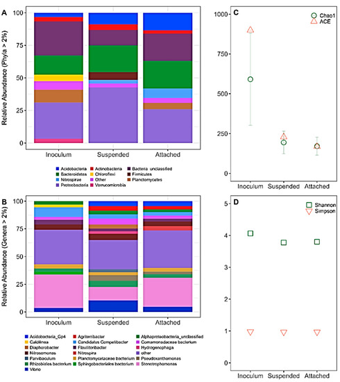 (A) Phylum level and (B) genus level relative abundance, (C) species richness, and (D) diversity indices of the original inoculum for both anode and cathode, suspended biomass in the cathode, and attached biofilm in the cathode after operating for 7 months. The “Other” legend key represents the aggregate of all taxa level identification with a relative abundance < 2%. ACE = abundance-based coverage estimator.