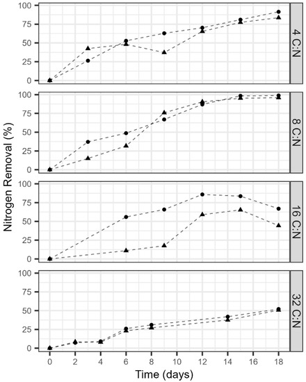 - Huang, B.; Feng, H.; Wang, M.; Li, N.; Cong, Y.; Shen, D. The effect of C/N ratio on nitrogen removal in a bioelectrochemical system. Bioresour. Technol. 2013, 132, 91–98. [Google Scholar] [CrossRef] [PubMed]