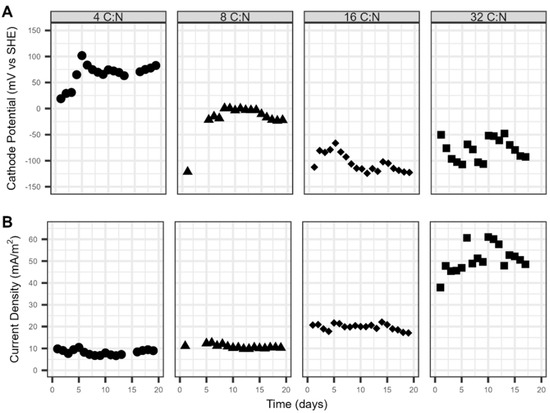 With a continuous flow anode, C:N ratios of 4 and 8 observed near complete removal of nitrogen within 18 days, with removal rates of 0.97 ± 0.21 and 1.15 ± 0.13 mg N L−1 d−1, respectively, (Figure 3). The nitrogen removal performance decreased as the C:N ratio increased. While the influent anode carbon concentrations were all distinct, each C:N ratio observed significant carbon removal. On average, the anode carbon removal performance across the respective replicates was 90.9 ± 23.2%, 94.2 ± 5.7%, 92.8 ± 26.8%, and 93.9 ± 24.7% for C:N ratios 4, 8, 16, and 32, respectively. The anodic CEs also improved with a constant carbon flux, observing values of 32.7 ± 0.15%, 19.9 ± 0.03%, 20.7 ± 0.06%, and 25.6 ± 0.06% for C:N ratios 4, 8, 16, and 32, respectively. While the microbial community composition of the anode was not explored, both anode and cathode began with the same rich and diverse inoculum. It is speculated that the combination of low anodic CE and high COD removal suggest that organic matter was oxidized by microorganisms that did not utilize the anode as an electron acceptor. Carbon diversion to methane production is likely but was not quantified. Interestingly, the observed cathode potentials also decreased with rising C:N ratios. The cathode potential and current production had an inverse relationship (Figure 4). The cathode potential decreased with increasing carbon availability at the anode. The average potentials during the cycles for ratios 4, 8, 16, and 32 were 66.1 ± 5.3, −17.7 ± 3.4, −104 ± 7.0, and −78.6 ± 9.8 mV vs. SHE.