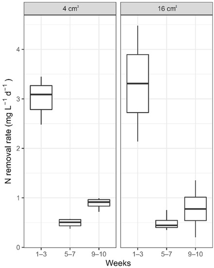 To assess the role of the PEM size on proton availability at the cathode, triplicate 100-mL biocathode MFCs were operated at 8 C:N and tested with either a 4 cm2 or 16 cm2 PEM. After operating for four weeks during a start-up period, the reactors were operated in semi-batch flow, with media replaced every three and seven days on both the anode and cathode sides, respectively, to identify rates of removal based on PEM size availability. The nitrogen removal rates for MFCs with either 4 or 16 cm2 decreased significantly during the first 3 weeks of data collection (Figure 5). The removal rates bounced back slightly by the end of the study, with PEM size 4 cm2 observing an average nitrogen removal of 0.88 ± 0.12 mg N L−1 d−1. The availability of a larger proton diffusion zone did not have a significant impact on the rate of denitrification by a biocathode. The data suggests that the relationship between the availability of electron donor and protons to facilitate reaction kinetics is complex and is further dependent upon the active microorganisms that enable the process.