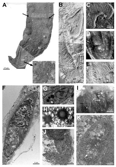The glandulomuscular region consists of a highly active secretory epithelium, coated with a well-developed muscular layer, longitudinally orientated at the anterior end of the organ and circularly at the posterior one (Figure 1B,F). Two parts of this region could be clearly distinguished by the appearance of the secretory granules: large, round, electron-dense granules were present in the anterior part (60 µm long) (Figure 1F), whereas in the posterior part small granules with an electron-dense transparent core and crystalline granules, resembling a spur with 11 rays (on the right side), were observed (Figure 1F,H). Moreover, and most importantly, in the anterior part of the glandulomuscular organ of four specimens, numerous spermatozoa were observed (Figure 1K) and inside the posterior part a straight, minute copulatory tube was visible (Figure 1B,D). The presence of spermatozoa and a copulatory tube inside the caudal organ indicated that these specimens were ready to copulate (see Discussion below).