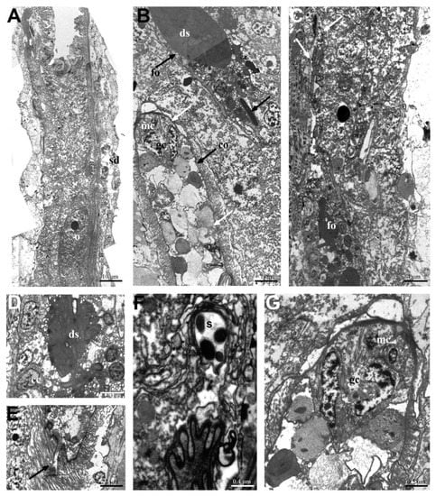 In Macrodasys sp. 3, the frontal organ has been documented only under TEM. It appears as a large ovoidal sac, made up of a monolayer of cuboidal cells delimiting a central space full of degenerating sperm packed in a large electron-dense mass (Figure 2B–D). Only a few sperm have the normal morphology (Figure 2B,F). Very long cytoplasmic protrusions of the cuboidal cells form a narrow channel that reaches the vitellogenic oocyte. In the anteriormost region of this channel, in contact with the mature oocyte, several spermatozoa were observed (Figure 2C,F). The frontal organ of Macrodasys sp. 3 lacks a sclerotized nozzle, and consequently, the internal pore of the frontal organ, through which sperm may reach the oocytes, remains elusive.