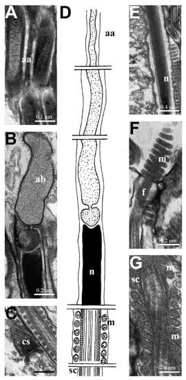 Mature spermatozoa of Macrodasys sp. 3. (A–C) TEM Longitudinal sections. (A) Acrosome apex. (B) Acrosome base and structure connecting it to the nucleus apex. (C) Structure connecting the nucleus to the flagellum. (D) Schematic drawing of the mature sperm. (E–G) TEM Longitudinal sections. (E) Detail of the nucleus. (F) Detail of the mitochondrion surrounding the anterior tract of the flagellum. (G) Detail of the mitochondrion surrounding the posterior part of the flagellum, aa-acrosome apex, ab-acrosomal base, cs-connecting structure, f-flagella, m-mitochondrion, n-nucleus, sc-striated cylinder.