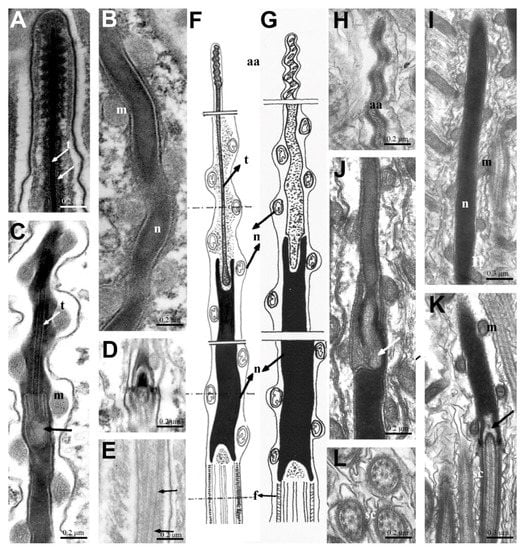 The nucleus is an elongated, straight or weakly helical rod of fully condensed chromatin, with an almost uniform diameter throughout its length (average diameter 0.2 µm) (Figure 3B,D,E and Figure 4B,F,G,I). At its posterior end, a hollow houses a characteristic structure connecting the nucleus to the flagellum (Figure 3C and Figure 4D,K). The flagellum contains a 9 × 2 + 2 axoneme in which the external doublets coil around the central singlets. A monolayered striated cylinder surrounds the axoneme (Figure 3D,G and Figure 4E,K,L).