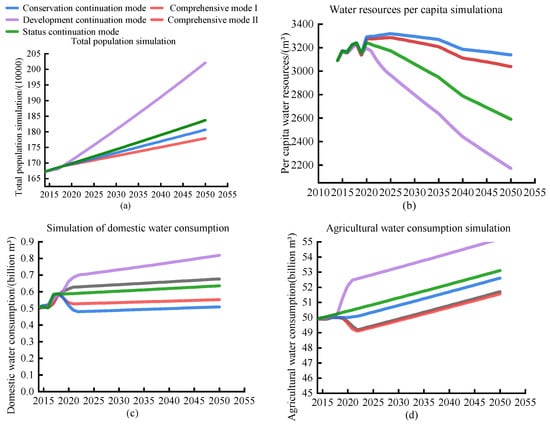 As can be seen from Figure 4, under the five scenarios, the total population (Figure 4a), domestic water consumption (Figure 4c), agricultural water consumption (Figure 4d), total water consumption (Figure 4f), and the total amount of sewage discharge (Figure 4e) all slowly increase, while the per capita water resources decrease (Figure 4b). The specific data are presented in Table 9. The status continuation mode and development continuation mode ensure stable economic development. Under the status quo continuation model and the development continuation model, the annual average per capita water resources decrease by 13.88 m3 and 25.75 m3, and the annual growth rate decreases by 0.004% and 0.98%, respectively. Under the conservation continuation mode, the per capita water resources basically remain in a stable state, indicating that the pressure on the water resources is the lowest, but this mode limits economic development. In contrast, the two comprehensive modes are superior in that the per capita water resources change slowly while ensuring stable economic development and slowing the increase in the total water consumption, which improves the water resources utilization in the short term. This shows that the balance of the per capita water resources can be guaranteed in the long term in the future through measures such as improving water use efficiency, reducing sewage discharge, and improving sewage treatment and utilization.