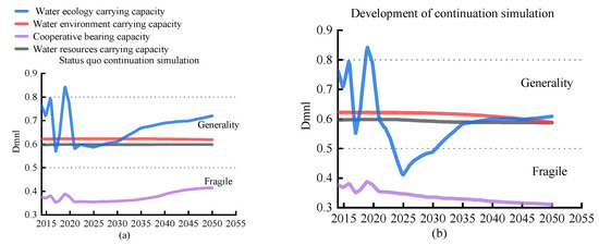 As is shown in Figure 6, the simulations under the five modes from 2021 to 2050 show that the water resources carrying capacity, water environment carrying capacity, water ecology carrying capacity, and collaborative bearing capacity are higher under the conservation continuation mode, comprehensive mode I, and comprehensive mode II than under the other two modes, and the changes in the water resources carrying capacity and water environment carrying capacity of Ulan Suhai Lake are small, while the changes in the water ecological carrying capacity are significant. The collaborative bearing capacity of Ulan Suhai Lake does not change significantly under the status continuation mode (Figure 6a) and remains in a fragile state for a long time. Under the development continuation mode (Figure 6b), economic development is accelerated. However, the lake’s carrying capacity gradually weakens, its carrying status changes from fragile to collapse, and its carrying level is extremely poor. Its collaborative bearing capacity gradually increases under the conservation continuation mode (Figure 6c), and in 2040 its bearing status changes from fragile to average, while its bearing level changes from poor to average. Its state increases under the two comprehensive modes, but changes slowly under comprehensive mode II (Figure 6e)and remains in a fragile state until 2049. Under comprehensive mode I (Figure 6d), the lake’s bearing capacity value is greater than 0.5 after 2043, its bearing status changes from fragile to average, and its bearing level increases from poor to average. In comparison, under the conservation continuation mode, the lake’s collaborative bearing capacity increases, but in terms of the local development strategy, this mode is not suitable for improving the lake’s carrying capacity. Under the development continuation mode, the lake’s collaborative bearing capacity decreases, which is not conducive to the protection of the water resources, water environment, and water ecology. Comprehensive mode I is more conducive than other modes to improving the lake’s carrying capacity value, and is thus the optimal solution.