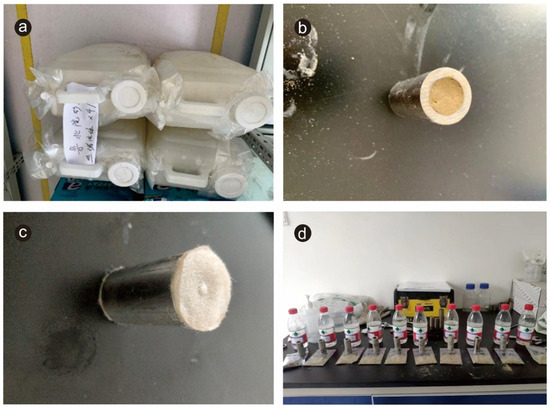 Preparation of water and rock samples. (a) Geothermal fluid collected from the sandstone geothermal reservoir; (b) Ground sandstone specimens filling stainless-steel pipes; (c) Stainless-steel pipe ends are blocked with filtered cotton; (d) Sandstone samples and fluid samples after the experiment for major elements and mineral analysis.