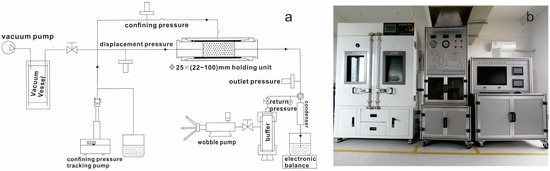 We installed the core-filled stainless-steel pipe into the core holder and tightened the screw knobs at both ends (inlet and outlet) to prevent leakage. The pure water was prepared for loading in the confining pressure. The geothermal fluid was prepared to flow through the core in the holder. A beaker and a balance were placed at the end of the water outlet to measure the water quantity (Figure 2). We opened the displacement experiment software and set the core-rock size, fluid viscosity, and density (Table 2). After starting, we observed the pressure, flow rate, and permeability changes on the screen, and then stopped injecting when the permeability stabilized (approximately 8 h). After the experiments, the core and geothermal fluid samples were tested for principal elements and mineral compositions (Figure 1d), which were used to analyze the water–rock interaction and element migration during the displacement process. The geochemical and mineralogical results from the initial geothermal fluids and cores refer to a separate paper [45].