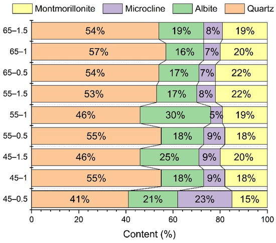 Concerning the mineral composition, the original rock before the experiment contained the maximum quartz content but without montmorillonite, while the ground sandstone specimens after the experiment did not contain calcite and muscovite, but montmorillonite was produced at different temperatures and flow conditions (Table 5). The montmorillonite content formed at different temperatures and flow rates ranged from 15–22%, showing an approximate trend of increasing montmorillonite content with increasing temperature (Figure 3; Table 5). Under the same temperature conditions, both at 45 °C and 55 °C, showed an increase in montmorillonite content with increasing flow rate, while 65 °C showed a decrease in montmorillonite content with increasing flow rate.