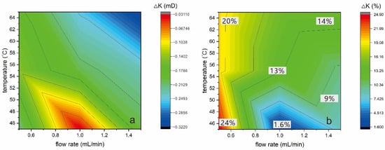 Contour plot of permeability variation for different temperatures and flow conditions. (a) Contour of permeability change values; (b) Percentage change in permeability after the experiment compared to the initial permeability. Note that all contour plots in this study are drawn using OriginPro 2022b and interpolated using the default algorithm, copyright © 1991–2022 OriginLab Corporation.