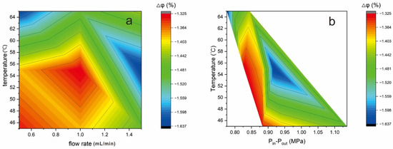 Contour plot of porosity variation under different conditions. (a) Porosity variation under different temperature and flow rate conditions; (b) Porosity variation under different temperature and differential pressure conditions.