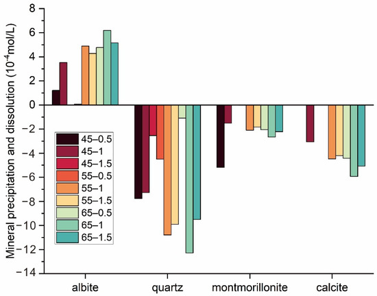 - During the experiments, quartz precipitated, albite and microcline dissolved, and montmorillonite was newly formed. A high temperature or high flow rate both led to an increase in the total volume change of minerals.