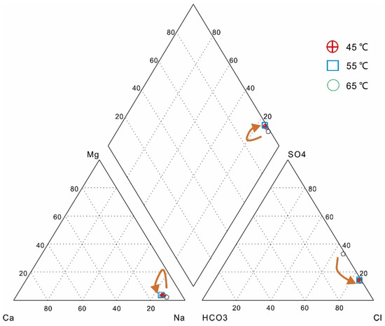 The hydrochemical compositions of 9 sets of samples are shown in Table 3. The hydrochemical types after the experiments were all the Na-Cl type, while the initial water samples were the Na-Cl-SO4 type (Figure 7). After the displacement, the anions of the water moved towards Cl. This could be due to the precipitation of SO4 in the water caused by an increase in temperature or a change in flow rate or the dissolution of Cl-rich minerals, resulting in an increase in the water’s Cl content.
