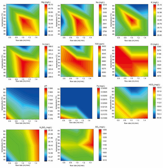Contour plots of the major elemental compositions of water after the displacement experiment under different temperature and flow conditions.