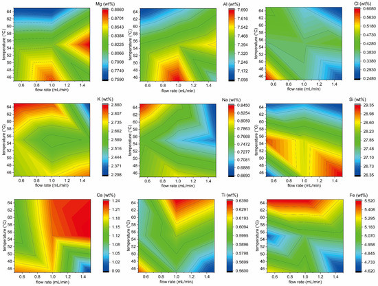 Contour plots of major elemental compositions of ground sandstone specimens after the displacement experiment under different temperature and flow conditions.