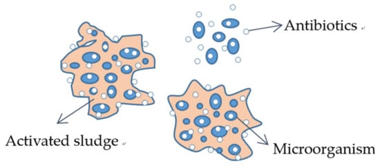 The activated sludge process, also known as the aerobic biological treatment process, can remove antibiotics from water through biodegradation and sludge adsorption [25]. Biodegradation mainly achieves the removal of antibiotics through two metabolic actions of microorganisms (Section 2.1 for details). However, the adsorption is mainly based on the fact that activated sludge is a porous flocculated microbial community and a combination of attached organic and inorganic substances, which has a large specific surface area and can be used as an adsorption carrier for pollutants. Some antibiotics can be adsorbed on the adsorption sites on the surface of sludge particles through intermolecular forces, such as electrostatic interactions, hydrophobic interactions and hydrogen bonds. Commonly used activated sludge methods are: conventional activated sludge (CAS) and sequencing batch reactor (SBR).