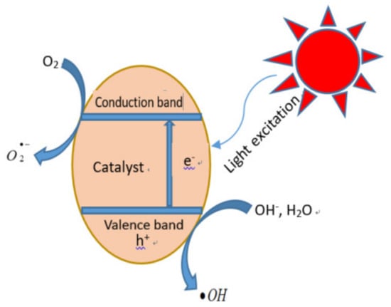Photocatalytic oxidation technology is a green, low-cost treatment technology. Photocatalytic reactions use semiconductors (S) as catalysts to remove organic and inorganic pollutants from water by causing an oxidation-reduction reaction through photoexcitation. Figure 4 shows the free radical generation mechanism of the photocatalytic reaction. The photocatalytic mechanism is based on the fact that when sunlight is irradiated on a semiconductor catalyst, electrons (e-) in the valence band (VB) of the catalyst are excited to the conduction band (CB), resulting in the generation of positively charged holes (h+) in the valence band, and negatively charged energetic electrons are generated in the conduction band (Equation (11)). However, positively charged holes (h+) generated in the valence band can further split water molecules to generate highly reactive hydroxyl radicals (Equation (12)). In addition, the negatively charged high-energy electrons generated in the conduction band can also be captured by oxygen molecules to generate superoxide radicals (Equation (13)). In addition, the free radicals generated in the reaction can generate more hydroxyl radicals through other pathways [146] (Equations (14)–(16)). The degradation of target pollutants by photocatalytic oxidation is mainly based on the strong oxidative and highly reactive hydroxyl radicals generated during the catalytic reaction. Based on the mild photocatalytic oxidation reaction conditions and strong oxidation performance, it is also used for the degradation of pollutant antibiotics. Joao et al. [147] found that the removal of antibiotics oxalic acid and tetracycline by TiO2 photocatalytic oxidation is mainly due to the action of active oxidant hydroxyl radicals, and the catalytic oxidation system not only has a good removal effect on antibiotics but also has high mineralization efficiency. Similarly, Thanh et al. [148] studied the effect of ZnO-modified TiO2 nanocomposites on the heterogeneous photocatalytic degradation of amoxicillin and found that the degradation and mineralization rates of amoxicillin were improved. To improve photocatalytic efficiency, a variety of catalytic materials have been used in photocatalytic research, including metal oxides and sulfides (TiO2, SnO2 and CdS), metal semiconductors (BiOBr, BiOCl, BiVO4 and GdVO4) [149,150,151,152] and non-metallic semiconductors (gC3N4) [153]. However, among many catalysts, TiO2 and BiVO4 are widely used in the removal of various antibiotics, such as tetracycline [154], ciprofloxacin [155,156], penicillin [157], norfloxacin [158], sulfamethoxazole [159], oxytetracycline [160], etc.