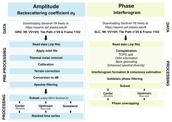 Flowchart of the processing steps for analysing both amplitude and phase of Sentinel-1 data. All the processing was done using SNAP (SeNtinel Applications Platform) software, version 8.0.0.