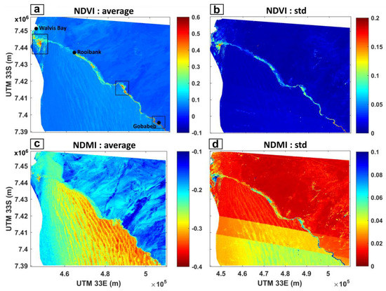 Figure 3 depicts the average of the spectral indexes calculated over the time-series. Figure 3a,b shows the temporal average for the NDVI and the associated standard deviation, while Figure 3c,d provides the average for the NDMI and its associated standard deviation. Figure 3a indicates high NDVI values in the study area, particularly in the downstream, deltaic part of the lower Kuiseb River; in the center, near Klipneus; and in the upstream part, near Gobabeb. These three areas are delineated by black boxes in Figure 3a. The standard deviation (Figure 3b) also shows high values for these areas, indicating strong seasonal and interannual vegetation responses.