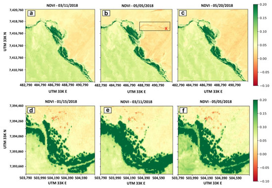 These maps guided us to select and define three sub-areas with high NDVI and NDMI variations. On Figure 4a–c, we present NDVI maps for the box in the center of the lower Kuiseb study area (see Figure 3a). At Klipneus, a tributary with negative NDVI values appears on 5 May 2018 (Figure 4b, black box and red cross) and is no longer detectable on the next date (Figure 4c). Negative NDVI values indicate the presence of water or moisture in the Klipneus tributary that were only briefly present during May 2018. Meteorological data from nearby weather stations indicate a rain event at the time, thus the negative values are therefore linked to the presence of water on the surface.