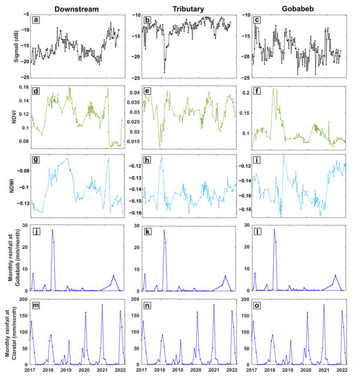 Upstream, at Gobabeb, variations in σ0 (Figure 5c) correspond to seasonal variations with the highest peaks during March–April. Increases in NDMI were followed by higher NDVI (Figure 5f,i) within—approximately—a month after the event. In 2021, a high peak in all parameters was linked to the January 2021 floods and rain in the upper catchment, such as on Claratal (Figure 5o).