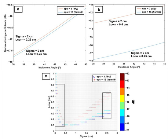 Surface backscattering model outputs with (a) fixed σ, Lcorr in dry/humid conditions; (b) different σ, Lcorr in dry/humid conditions; and (c) σ, Lcorr values in the black boxes allow us to reproduce σ0 variations observed in the Sentinel-1 time-series from the lower Kuiseb River.