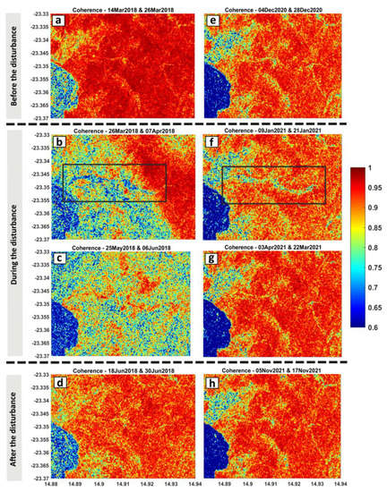 Coherence maps associated with the tributary area at Klipneus in Figure 7a, adjacent to the Kuiseb river channel. (a–d) are coherence maps associated with a local rain event in 2018; (e–h) are coherence maps associated with a flood event in 2021.