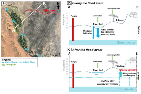 A possible explanation of the process is illustrated in Figure 9. In Figure 9a the tributary is outlined in red, with the Kuiseb floodplains in green and water flow along the main channel in blue. Figure 9b,c are photographs of a flood event. Figure 9d represents an idealised topographic profile along a transect in Figure 9a (in white) across the Kuiseb River bed and the Klipneus tributary. During a flood event, water will infiltrate into the river bed (at a rate of 8–12 mm/h, after [3]) and from overspill on the floodplain, but some water will be lost through evapotranspiration, evaporation, and pumping water for human activities. After a flood event, as presented in Figure 9e, groundwater levels will rise due to the recharge from infiltration, which would be the origin of variations in returns from the radar signal (coherence) in the tributary. As moisture levels rise and come closer to the surface, it will produce a change in the interferometric phase, i.e., a drop in coherence between different dates of acquisition. Groundwater level rise is the cause of an increase in surface moisture, resulting in a decrease in the coherence measured by the Sentinel-1 data. Indeed, the phase depends on the dielectric properties of the soil and will be sensitive to the presence of water/moisture.
