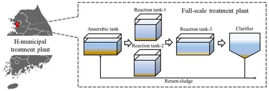 This study examined a data set from the H-municipal treatment plant for nutrient removal, which is situated in South Korea. This WWTP is built for a mean capacity of 22,000 tons/day. The WWTP has a sedimentation tank, anaerobic/aerobic reactors, and a clarifier. As shown in Figure 1, the WWTP consisted of pretreatment, a grit chamber, and an activated sludge system, which included anaerobic, anoxic, and aerobic tanks. The biological treatment system was followed by a secondary clarifier and then treated with flocculation, sedimentation, sand filtration, and disinfection before discharge as the final effluent.