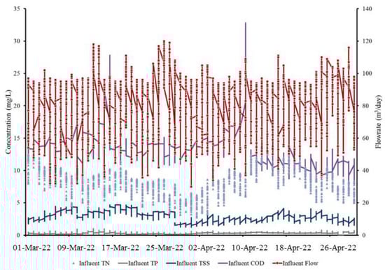A training set of data consisting of hourly measurements of total nitrogen (TN), total suspended solids (TSS), biological oxygen demand (BOD), chemical oxygen demand (COD), mixed liquor suspended solids (MLSS), total phosphorus (TP), influent flowrate (Qin), effluent flowrate (Qeff), return flowrate (RAS), waste flowrate (WAS), and dissolved oxygen (DO). The statistics of WWTP influent and effluent waste quality data are shown in Table 1. The mean influent COD, MLSS, TSS, TN, and TP were 13.06 mg/L, 2892.07 mg/L, 2.76 mg/L, 8.13 mg/L, and 0.35 mg/L, respectively. In addition, two months (1 March 2022–30 April 2022) hourly dataset were chosen for a dynamic-state model testing and prediction, which is shown in Figure 2. The operation data were collected in real time, with a data collection frequency of 1 h. Furthermore, to produce an appropriate model, the dataset must be standardized, and unnecessary datasets must be removed to prevent overfitting. One of the primary objectives of this research is to assess the impact of relevant parameters on model accuracy with or without sensor data.