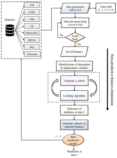Recursive feature elimination is a procedure that eliminates nonpredictive features without increasing the model’s error, hence accelerating learning and minimizing training time. Therefore, the most useful data with predictive capabilities are crucial. Nkiama et al. [] used an RFE approach coupled with a decision-tree-based classifier to extract pertinent characteristics for the goal of enhancing a detection system. The study offers credence to the notion that feature selection based on RFE may be utilized to enhance classifier performance and identify significant features of influent and effluent water quality parameters. Figure 3 depicts the RFE method of removing nonpredictive characteristics implemented in this study. This represents the procedure for data generation, directly taken from the SCADA database, preprocessing, and elimination of water parameters using RFE with a decision tree model as the eliminator. At each time step t feature selection, the effluent TN at t is predicted, and the operation is repeated until completion.