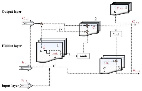 The depth of LSTM architecture determines the important forget gate , whereas the input gate updates the additions using the term of candidates , and then the output gate generates the prediction values, as given in Equations (3)–(6) [].