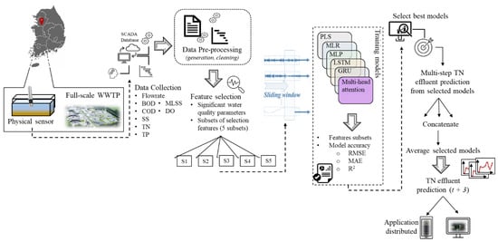This research proposes a unique hybrid paradigm for predicting the changing effluent loads of WWTPs with complicated processes. In this regard, the contribution of this study is the development of a specialized multistep prediction model based on ML and RNN algorithms that can maintain predictive capability at different time horizons by addressing the highly nonlinear characteristics of the influent and effluent dataset in the presence and absence of sensors. This study’s novelties include: (1) The data preprocessing step combines the hourly recorded time series sensor and operating parameters, applies min–max normalization, and generates time shift data; (2) The feature selection phase finds the relevant features by using wrapper feature selection. The wrapper-based RFE selects the optimal features using decision tree as the feature evaluator and finds the optimal subset of features for high predictive ability; (3) The deep prediction phase predicts the future effluent TN by using predictive models, including partial least squares (PLS), MLR, multilayer perceptron (MLP), LSTM, gated recurrent unit (GRU), and multihead-attention-based GRU (MAGRU). The performance of the predictive models is conducted to select the best models and determine the multistep sequence prediction of the effluent TN. The proposed innovative framework showed a greater capacity for prediction by virtue of its ML and RNN architectures. To verify the applicability of the proposed prediction methodology for directing the short- and long-term operational strategies of WWTPs, it was applied to multistep (1 h and 3 h ahead) prediction horizons over a case study, a WWTP in South Korea. The outcome of this study is highly beneficial to industrialists and policymakers when devising proactive decisions for enhanced wastewater treatment management.