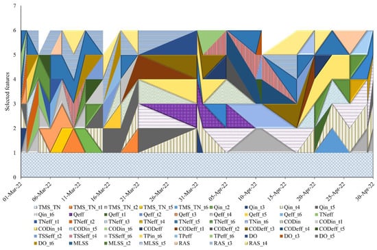After preliminary screening, 52 variables are selected as the input of the RFE which includes four influent parameters recorded using a physical sensor (CODin, TPin, TSSin, and TNin,), four effluent parameters (CODeff, TPeff, TSSeff, and TNeff), and reactor parameters (TMS_TN, DO, MLSS, and WAS, RAS, Qin, and Qeff). The top six dependent variables were selected at current time step t. Figure 8 illustrated the selection of water parameters in time series for the period of two months. The patterns represent the sensor, reactors, influent, and effluent parameters, where TMS-TN was selected at each time step t. The subsets of five of the selected parameters were taken for the training models, which are described in the following section.