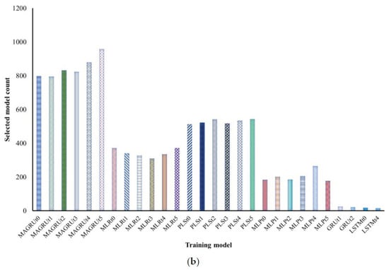 The MAGRU method reported the most accurate and selective predictive performance among all introduced models in various subsets. Generally, the mean absolute error and higher R2 throughout the data groups, and for modeled parameters of TN, are indications of the MAGRU’s robustness. The PLS obtained the second most accurate model compared to the reported ML models. At the same time, it shows that the MAGRU and PLS models outperform the GRU and LSTM neural networks. The MAE of the PLSt5 approximating wastewater treatment processes was 0.41 for effluent TN, while the MAE of the predicted TN using the MAGRUt5 was 0.28. The rest of the performance for all models can be seen in Figure 9a. Detailed information on the selection of the models can be found in Figures S1–S4 of the Supplementary Information. The total number of counts of each model in the training period can be seen in Figure 9b. It shows that MAGRU was selected most of the time as the best model, where MAGRUt5 is ranked first with a total count of 958.