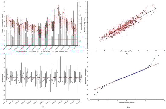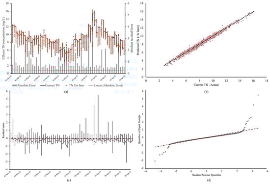 Three-hour ahead prediction performance visualization of (a) a time series of predicted effluent TN, (b) a scatter plot of predicted and current TN values, (c) the generated residuals, and (d) the quantile–quantile plot for model residuals.