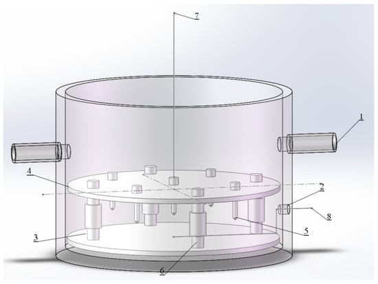 A novel reactor was designed as a cylinder with well appropriate between the plasma discharge area and the grounded electrode in the bottom of the reactor. The novel reactor could increase the effective discharge area for active species formation during the plasma process. The fully propagated plasma occupied a roughly circular region on the liquid surface with visually uniform leader distribution []. As shown in Figure 1, the novel plasma reactor was an organic glass reactor with a 50 mL effective volume for MO removal from simulated wastewater. In detail, the bottom radius was 50 mm, the height was 70 mm, and the wall thickness was 5 mm. Two air vents with a radius of 4 mm were set on both sides, which were 20 mm away from the top of the reactor. A sample collection hole with a 4 mm diameter was installed at 12 mm away from the bottom of reactor. The mass transfer efficiency of active species in liquid could be improved by enhancing the air tightness of the reactor, all vents were blocked with an airtight polymer cap during the operation. The circular grounded metal electrode plate with a 45 mm radius and 2 mm thickness was immersed in the MO solution, the same size as a perforated metal plate fixed with needle-like electrodes was used as high voltage discharge electrode plate. Needle-like electrodes were stainless steels which widely used due to their mechanical and anti-corrosion properties []. The nylon columns were used to support the high voltage electrode and the grounded electrode, and the high voltage electrode could be adjusted by the distance above the solution.