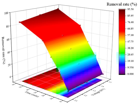 Discharge plasma originated by high voltage on the gas-liquid surface would generate various active species in the solution []. Thus, the discharge voltage was a significant factor on the removal of azo dye during the plasma treatment. To evaluate the effect of discharge voltage on MO removal, systematic experiments were implemented on plasma treatment with different applied voltages of 11 kV, 13 kV, and 15 kV. The other experiment parameters of the discharge needle numbers were set as 5, and the discharge gap was 20 mm. As shown from the contour plot of the response surface in Figure 2, the colors changed gradually from purple to red, which demonstrated that the removal rates of MO were enhanced over time. In addition, there was an increase at the same altitude, the removal rates of MO were improved with the voltage increasing in a certain applied voltage range. The interaction of voltage and treatment time showed a positive effect for the removal rate of MO. The removal rates of MO were 85.0%, 90.3%, and 95.1% at 60 min when each applied voltage were 11 kV, 13 kV, and 15 kV, respectively. This phenomenon was consistent with supplementary free radicals generated by high applied voltage []. Because additional energy electrons could be produced with the application of increasing voltages, which could intensify the collision chance between energetic electrons and air molecules effectively, thereafter producing extra excited oxygen atoms that could react with water molecules to generate extra HO• [,]. On the other hand, the plasma treatment process could generate ultraviolet radiation that improved the removal rate of MO, and the intensity of ultraviolet radiation could be enhanced at relatively high applied voltage []. However, high applied voltage would cost additional energy consumption and reduce energy utilization []. Therefore, the applied voltage was selected as 15 kV.