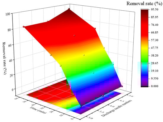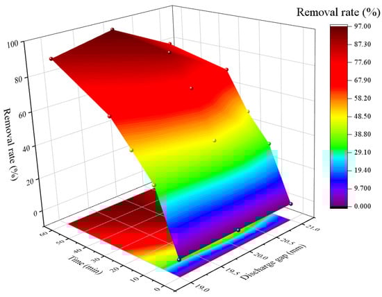 The numbers of discharge needle electrodes are related to the plasma channels between the discharge needle and liquid surface []; thus, it is important to get a suitable discharge needle numbers to enhance the removal rate of MO. To estimate the influence of discharge needle numbers on MO removal, different discharge needle numbers of 3, 4, and 5 were conducted in this plasma treatment. The other parameters were related to the applied voltage of 15 kV, and the discharge gap of 20 mm. As shown in the contour plot of the response surface in Figure 4, the removal rates of MO were improved with the growth of the treatment period and discharge needles number, subsequently the removal rate of MO was up to 95.1% at 60 min when the discharge needles number was 5. The results verified that the increase in discharge needle numbers expanded the discharge region to promote the chemical reactions between active species and MO []. However, the removal rates of MO were decreased to 82.5% and 82.8% individually at 60 min when the discharge needle numbers were 3 and 4, respectively. In general, needle-like electrodes generated fully propagated plasma channels at the liquid surface, and all types of active species were produced near plasma channels, thereafter the removal of MO mainly occurred in this circular area [,]. With the decline of discharge needle numbers, the plasma channels decreased, so the removal rates of MO were inferior due to depressed reaction region of active species with MO []. Therefore, 5 were chosen as the optimal discharge needles numbers in this study.