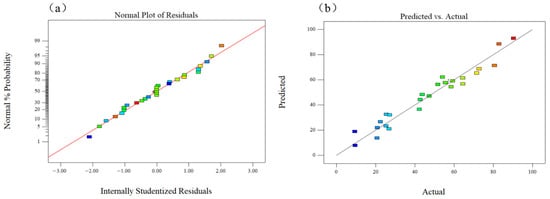 The significance of experimental factors was judged by F-value and p-value in ANOVA analysis, F-value was the accuracy of generated quadratic polynomial equation computed statistically, and the experimental factor was significant when the p-value < 0.05. The ANOVA results for response surface of the quadratic model were listed in Table 3. MO independent variable of time (A and A2), voltage (B and B2), discharge gap (C2), discharge needle numbers (D), and the interaction of AB were significant for the removal efficiency. However, the interaction of AC, AD, BC, BD, and CD were insignificant, and the independent variable of C and D2 were also insignificant. Therefore, the influence parameters for the MO by the plasma technique followed the order of time (A) ≈ voltage (B) > discharge needle numbers (D) > discharge gap (C). The Predicted R2 = 0.7119 was in reasonable agreement with the Adjusted R2 = 0.9000 because the difference < 0.2. The signal of noise ratio about Adep Precision = 16.954 > 4 demonstrating that the signal was acceptable due to among the desirable region. According to the parameters of p-value < 0.0001, R2 = 0.9500, which demonstrated the prediction model was appropriate for describing the plasma experimental data. As shown in Figure 5a, all residuals spread along a straight line that demonstrated a normal probability distribution plot of MO obtained removal rates which were employed to validate the normality of studentized residuals. Furthermore, Figure 5b correspondingly exhibited the predict and actual values of removal rates as another confirmation.