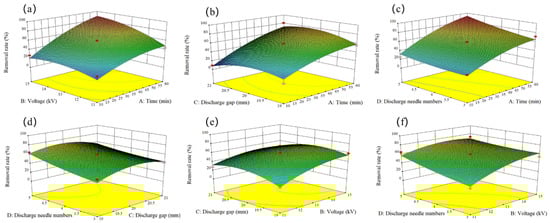 RSM for degradation efficiency of MO as a function of voltage and time (a), discharge gap and time (b), discharge needle numbers and time (c), discharge needle numbers and discharge gap (d), discharge gap and voltage (e), discharge needle numbers and voltage (f).