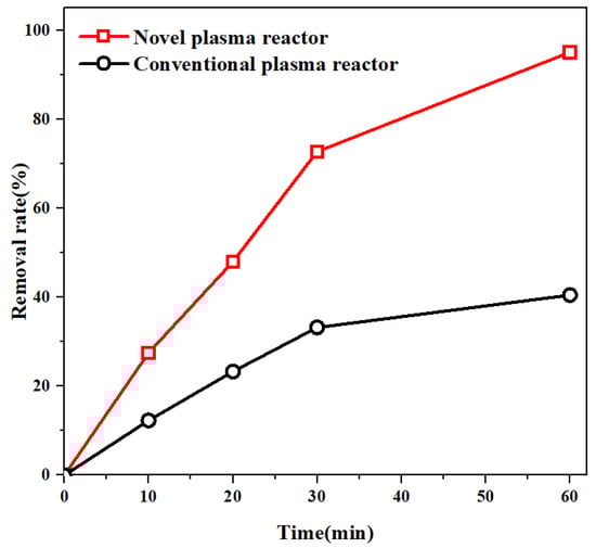 The comparison of novel and conventional reactor for the removal rates of MO (the novel plasma reactor (V = 50 mL) and the conventional plasma reactor (V = 150 mL) under the same conditions of initial concentration = 100 mg/L, voltage = 15 kV, discharge gap = 20 mm, and discharge needle numbers = 5).