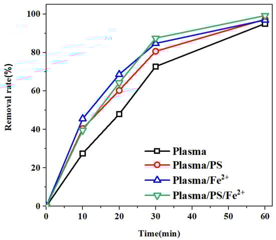 The removal rates of MO under plasma, plasma/PS, plasma/Fe2+ and plasma/PS/Fe2+ systems.