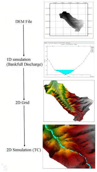 The TC was then estimated by a two-dimensional hydraulic simulation of the water parcel flowing along the longest watercourse. For this purpose, the bank-full discharges were introduced to the two-dimensional model as upstream boundary conditions. The uniform flow with a slope of 3% was defined as a downstream boundary condition. The computational cell sizes were determined by trial and error in order to stabilize the numerical model. Computational cells of 1 to 20 m sizes with time steps of 1 s to 1 min were tested in the trial-and-error process. Finally, a computational cell size of 4 m and a time step of 10 s were chosen. After the mesh size was computed, the boundary conditions were introduced to the two-dimensional model. Since the bank-full discharge was defined within an interval between 2.53 and 3.53 m3/s, the simulation was performed twice, each time with one side of the range (displayed as Qb (max) and Qb (min), respectively). Figure 2 illustrates the process of estimating TC by two-dimensional hydraulic simulation.